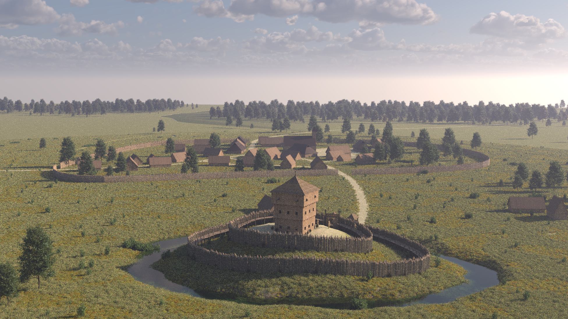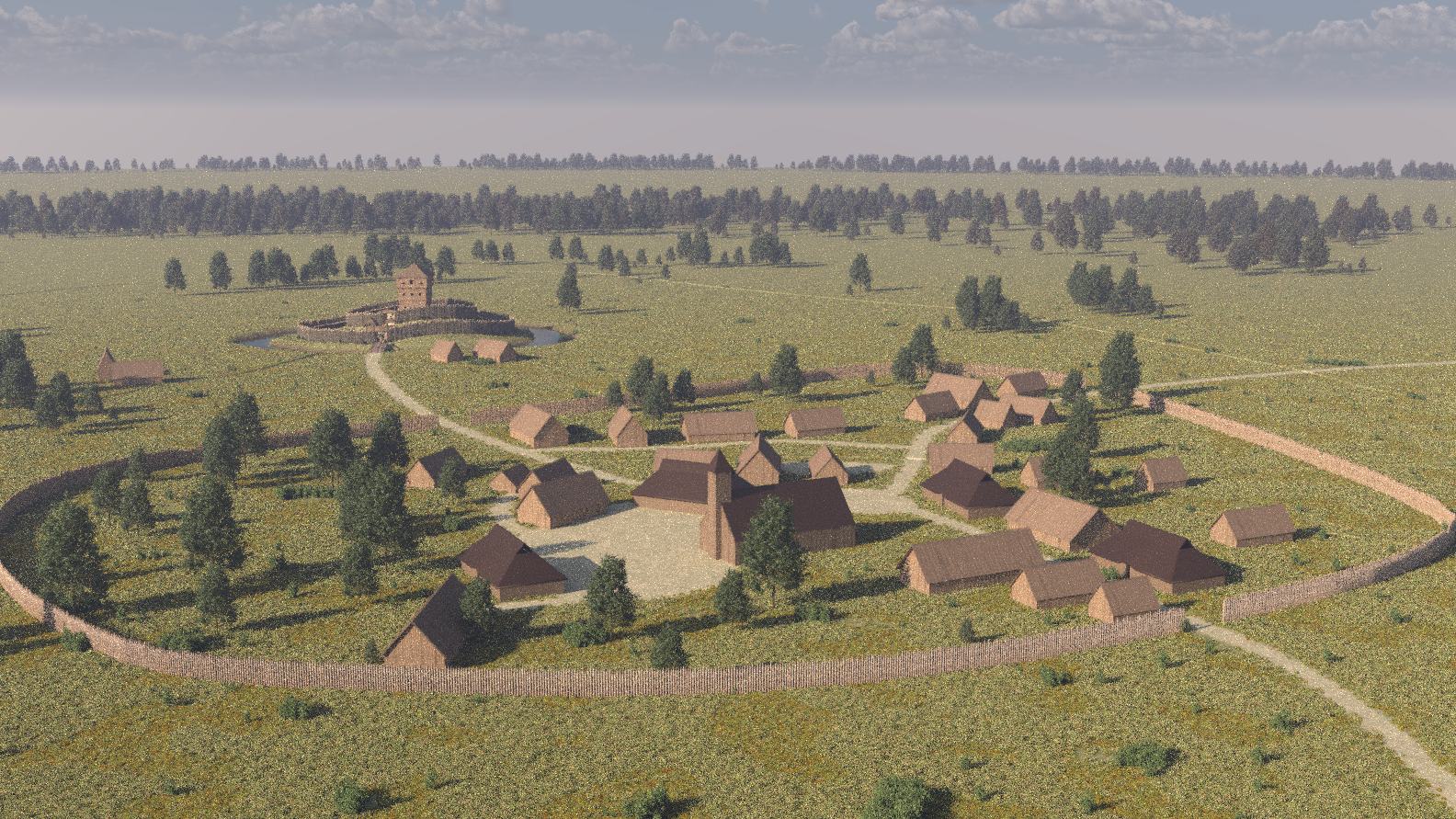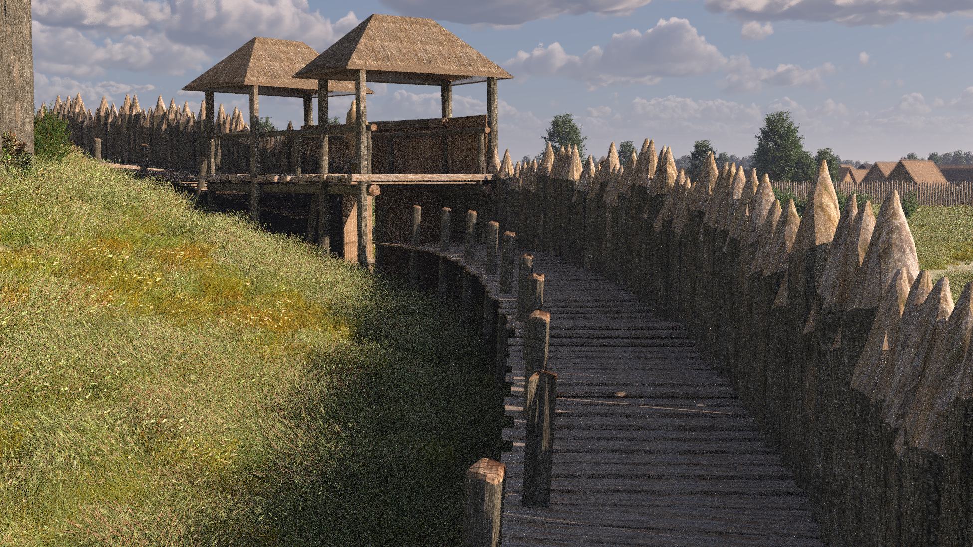 Erdhügel standen, umgeben von Palisaden und einem Graben. Dieser Standort mit seinen Ausläufern des