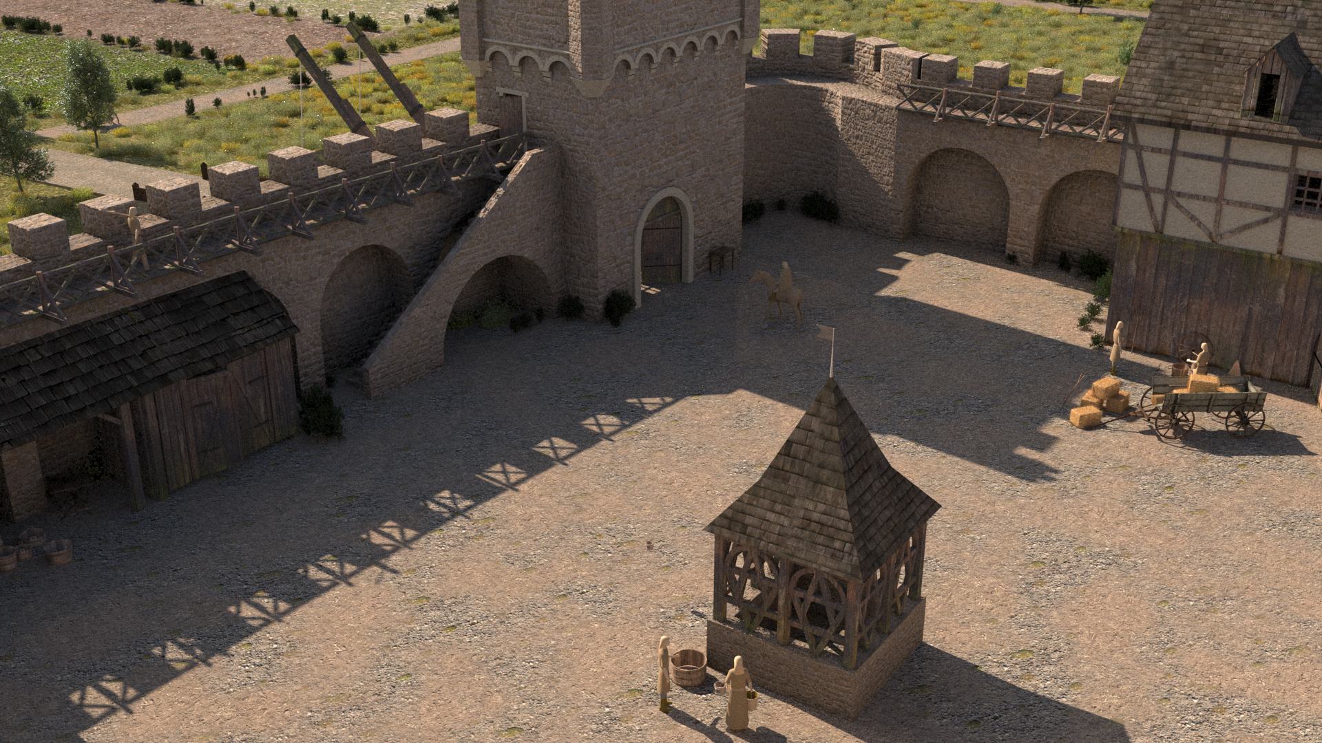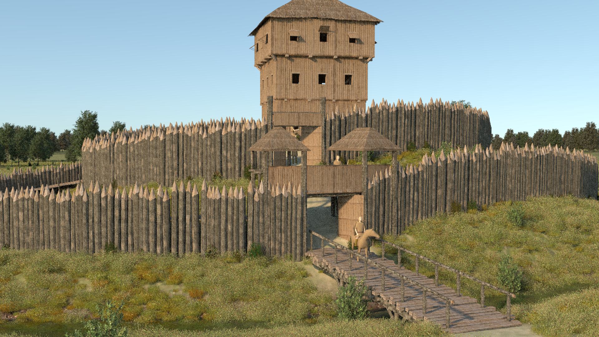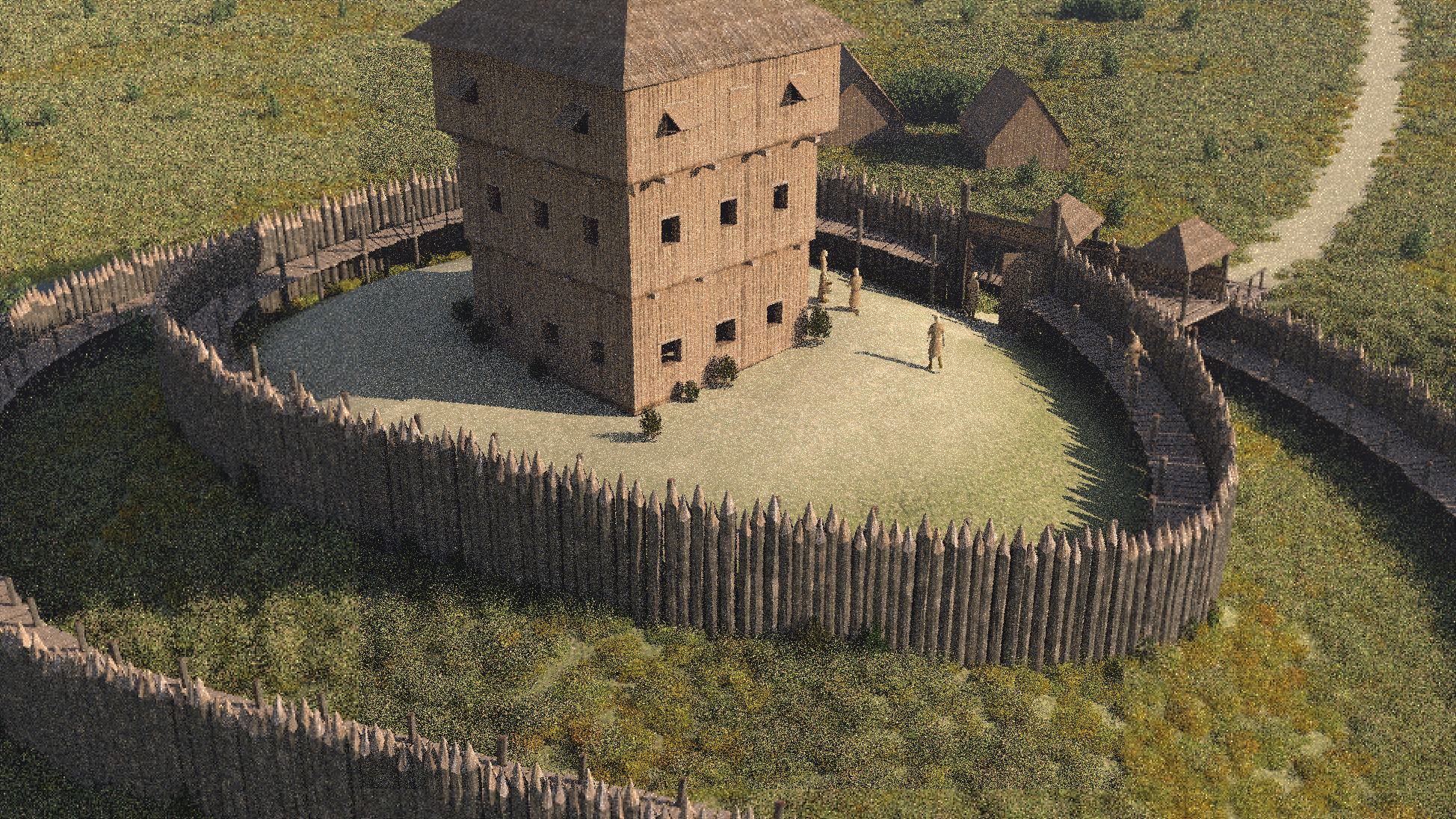 Wehrgang sind nicht zu erkennen. Stattdessen ist das Burgareal offensichtlich von einer Palisade
