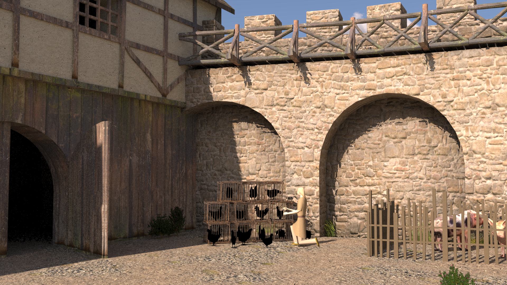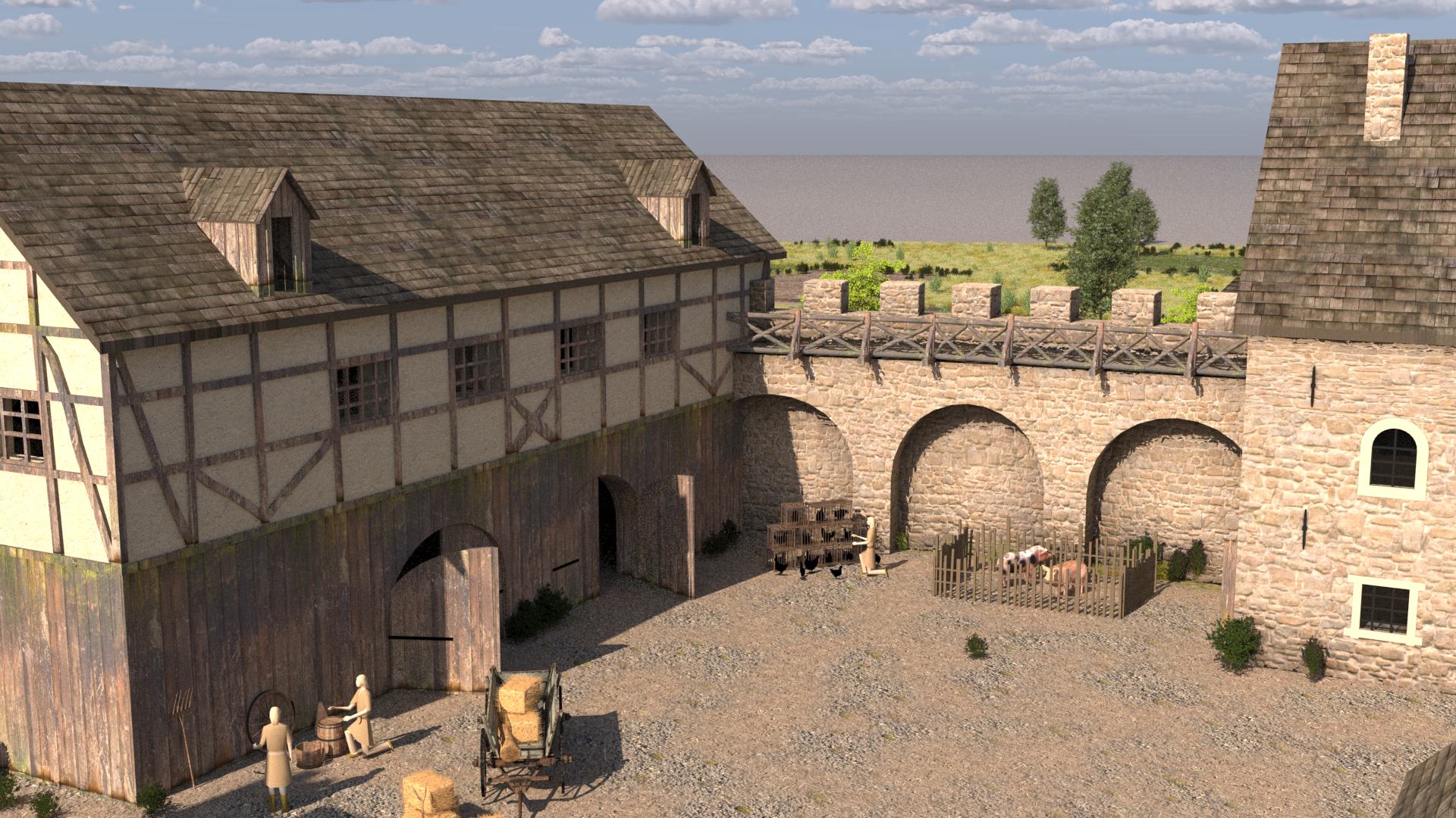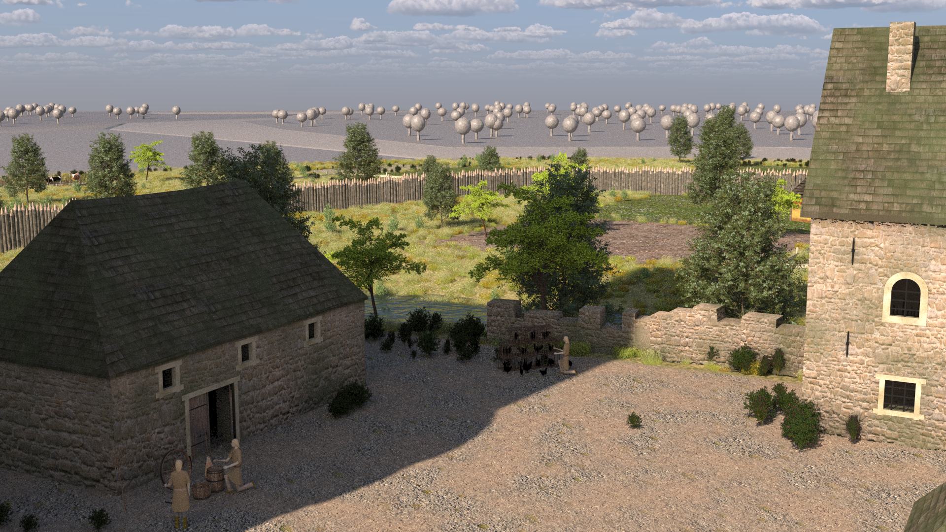 Wehrgang sind nicht zu erkennen. Stattdessen ist das Burgareal offensichtlich von einer Palisade