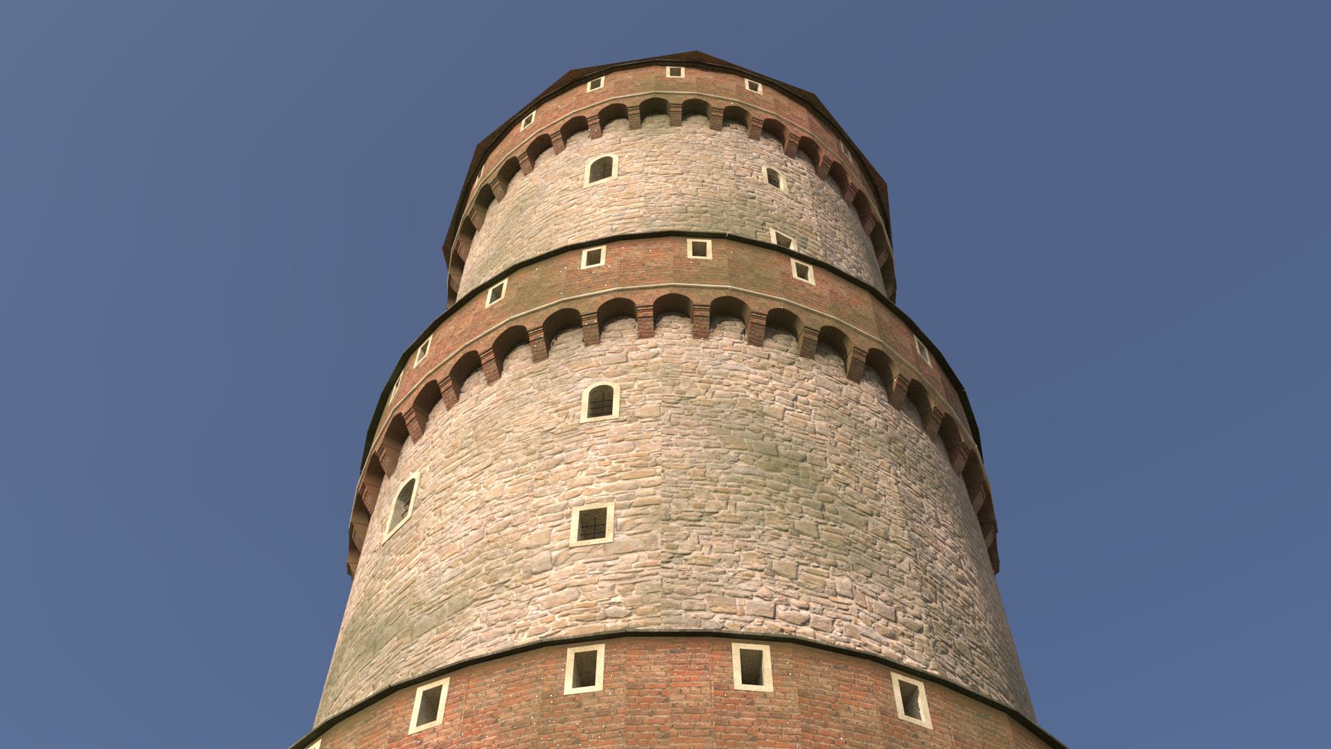 Der Burghelm ist dem Feuer zum Opfer gefallen. Überliefert ist die Höhe des Turms von 40 Metern.