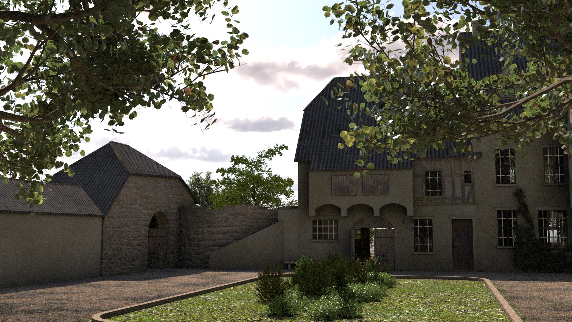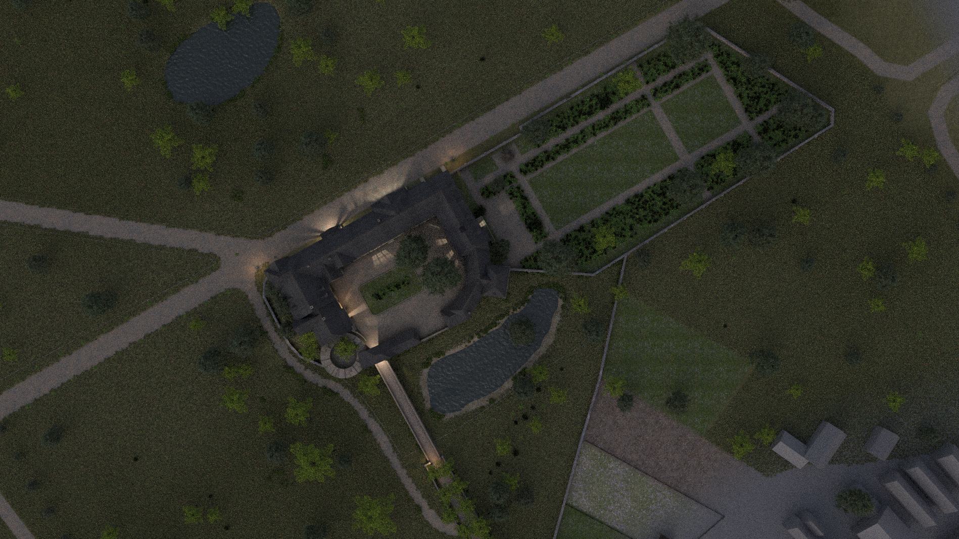 umgeben. Kleinere Gebäude stehen innerhalb der Anlage. Viel Vegetation zwischen den Gebäuden.