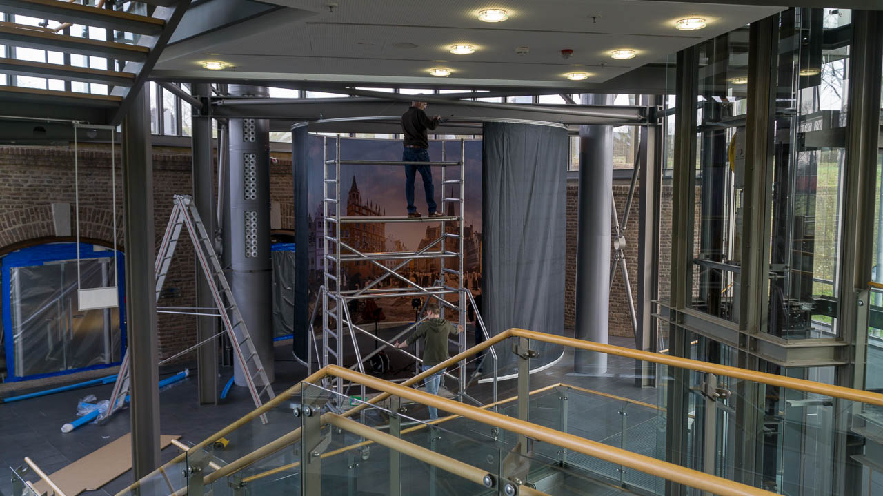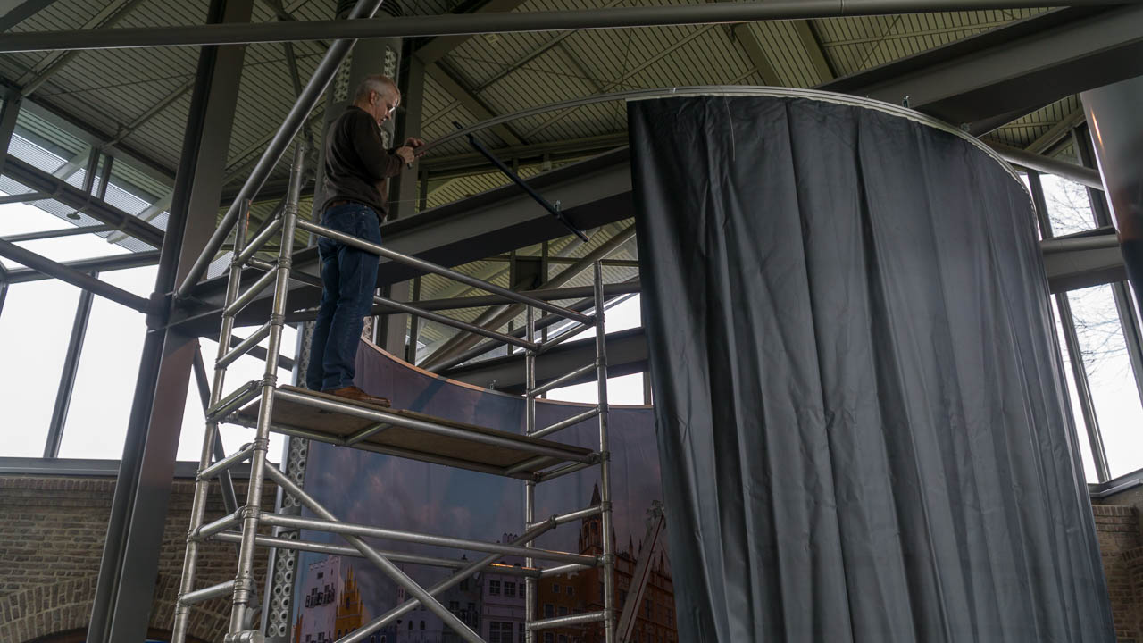Bevor das Panorama gedruckt und aufgehängt werden konnte, musste eine Konstruktion überlegt werden, an der das Panorama hängen sollte. Mittels Schienen und Querstangen gelang es uns, das 12 Meter lange „Monstrum“ sicher zu montieren. Für den Druck wurde lichtundurchlässiger Theaterstoff verwendet, um unschöne Lichteinfälle zu vermeiden.