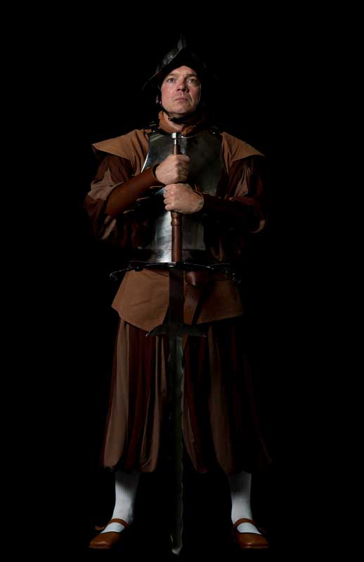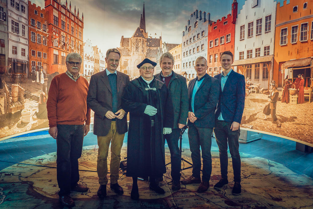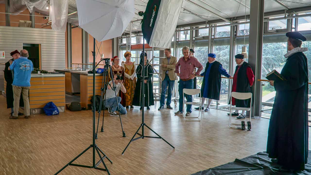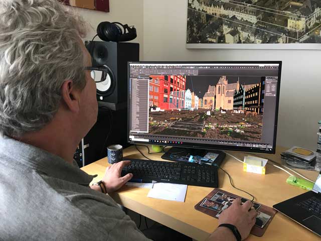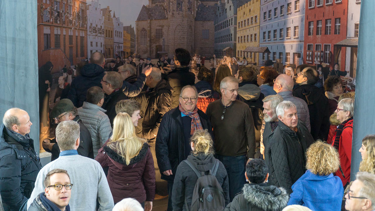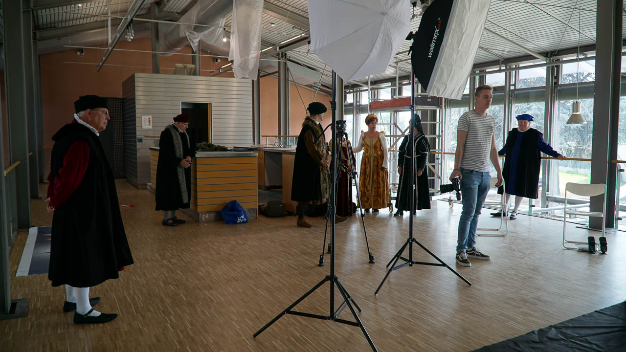 Während die Rekonstruktion des Marktplatzes im Gange war, arrangierten wir Akteure, die bestimmte Personen im Panorama darstellen sollten. Die Weseler Hansegilde mit ihrem umfangreichen Fundus an mittelalterlichen Kostümen stellte sich zur Verfügung. Bekannte Persönlichkeiten, darunter die Weseler Bürgermeisterin ließen sich einkleiden und traten vor die Kamera.