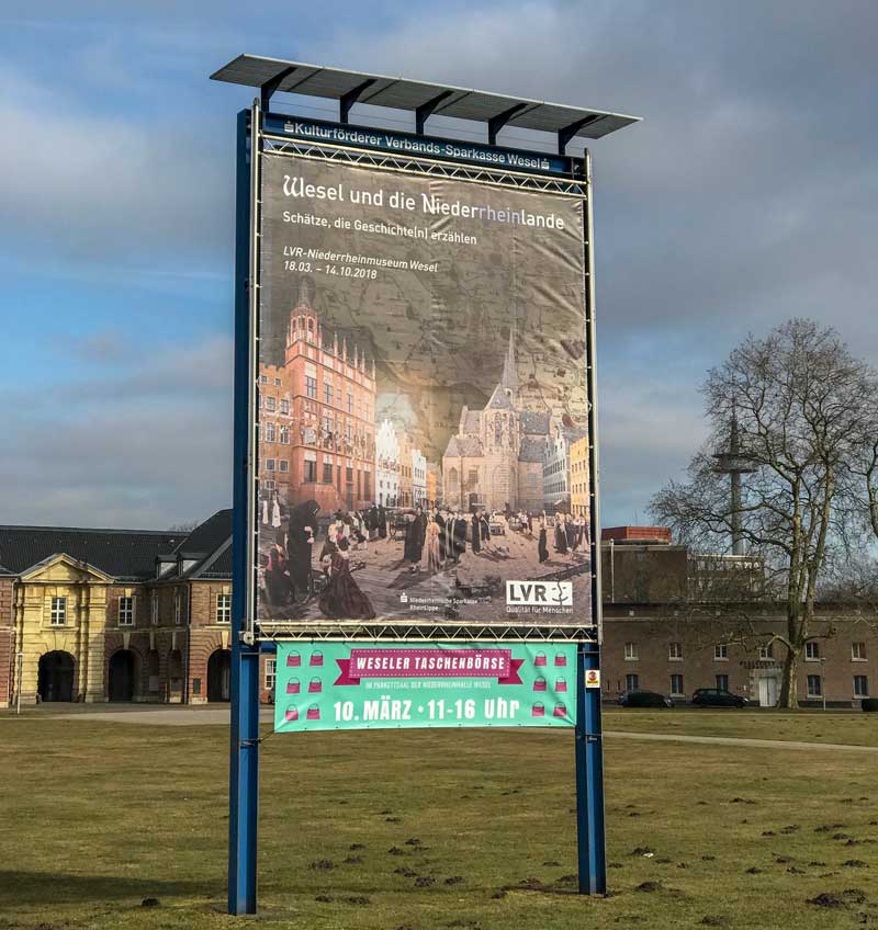 Das Motiv ist so markant, dass es vielfach aufgegriffen wurde: großformatig an der Aussenfassade des Museums, auf diversen Großbannern im Außenbereich in und um Wesel, auf Plakaten, Flyern und natürlich in der Presse.