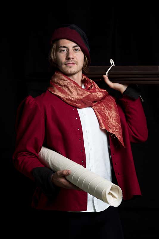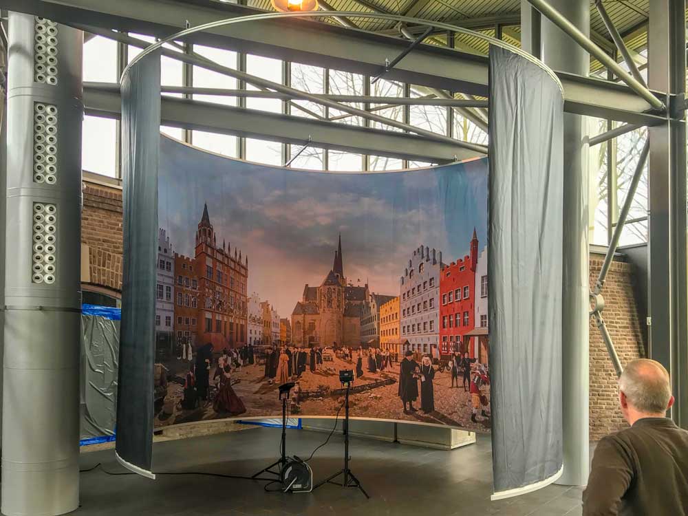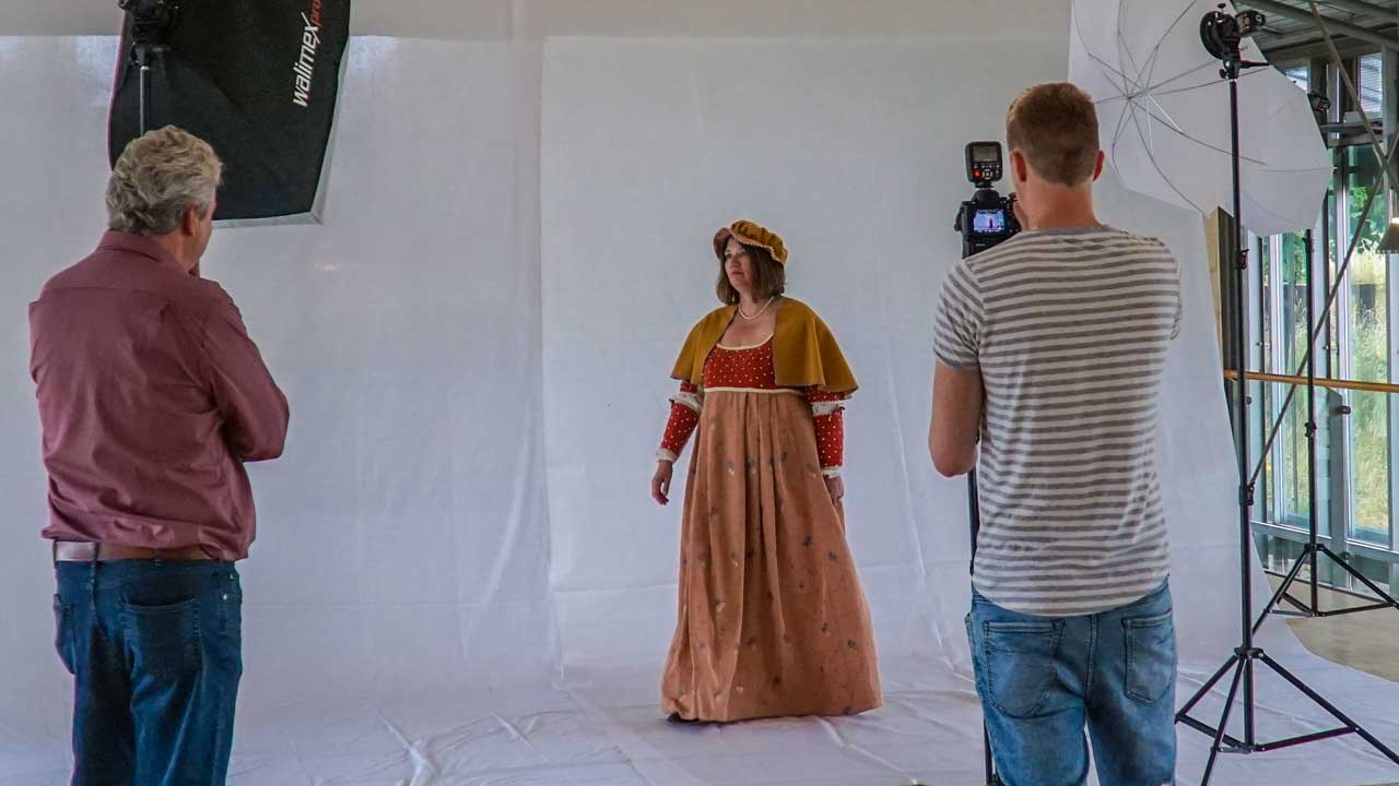 Nun mussten die Akteure fotografiert werden. Damit sich diese auch perfekt in den Marktplatz integrieren konnten, war es wichtig, beim Fotografieren auf Perspektive und Licht zu achten. Im LVR-Niederrheinmuseum hatten wir dazu eigens ein Fotostudio eingerichtet. Vor weißem Hintergrund mit Studioblitzen, um das Licht künstlich nachzustellen.